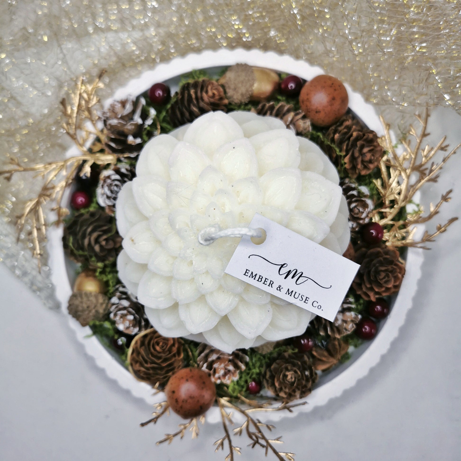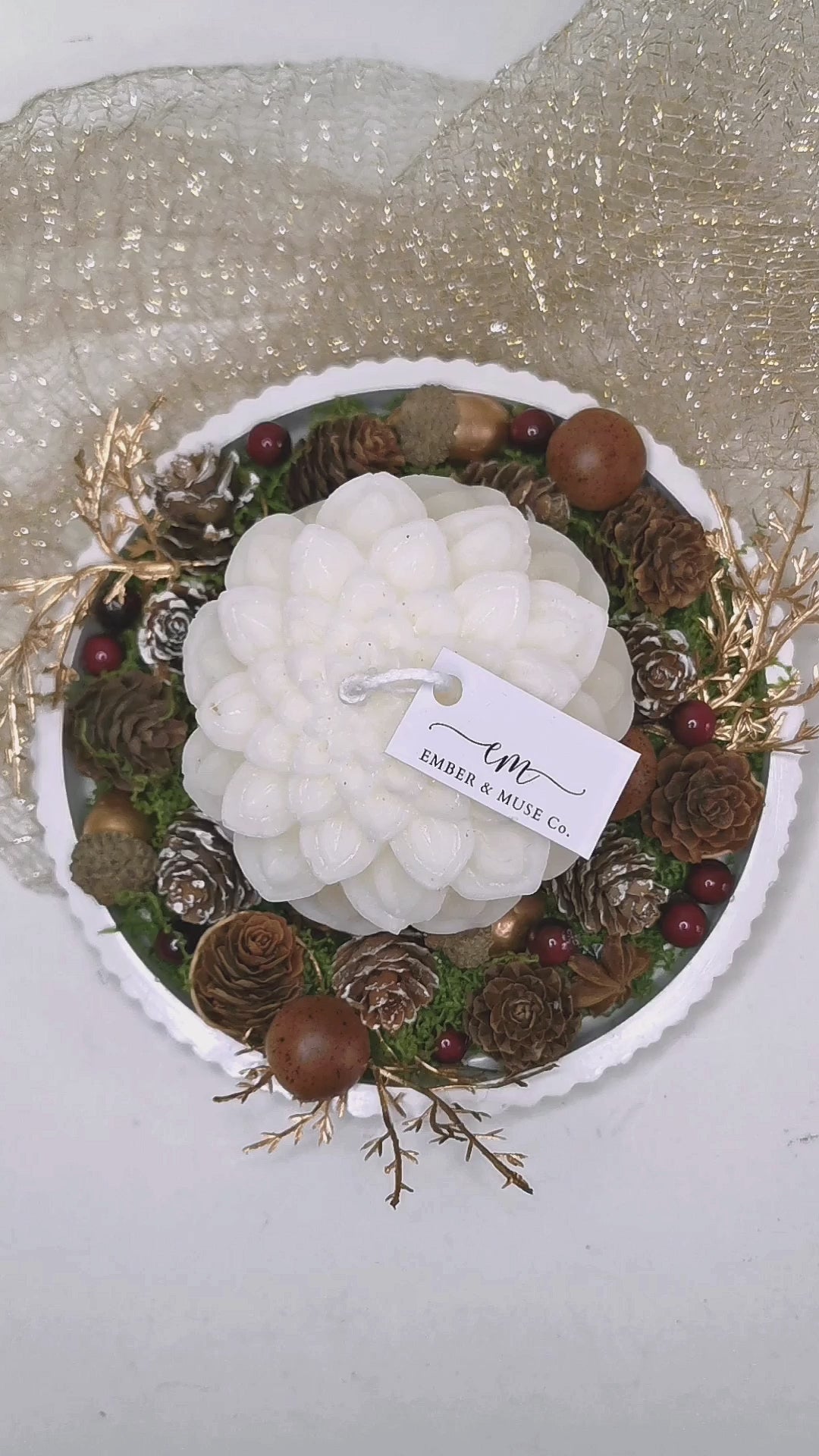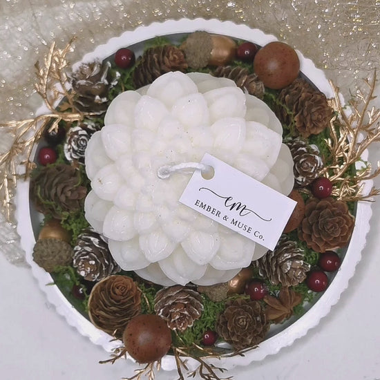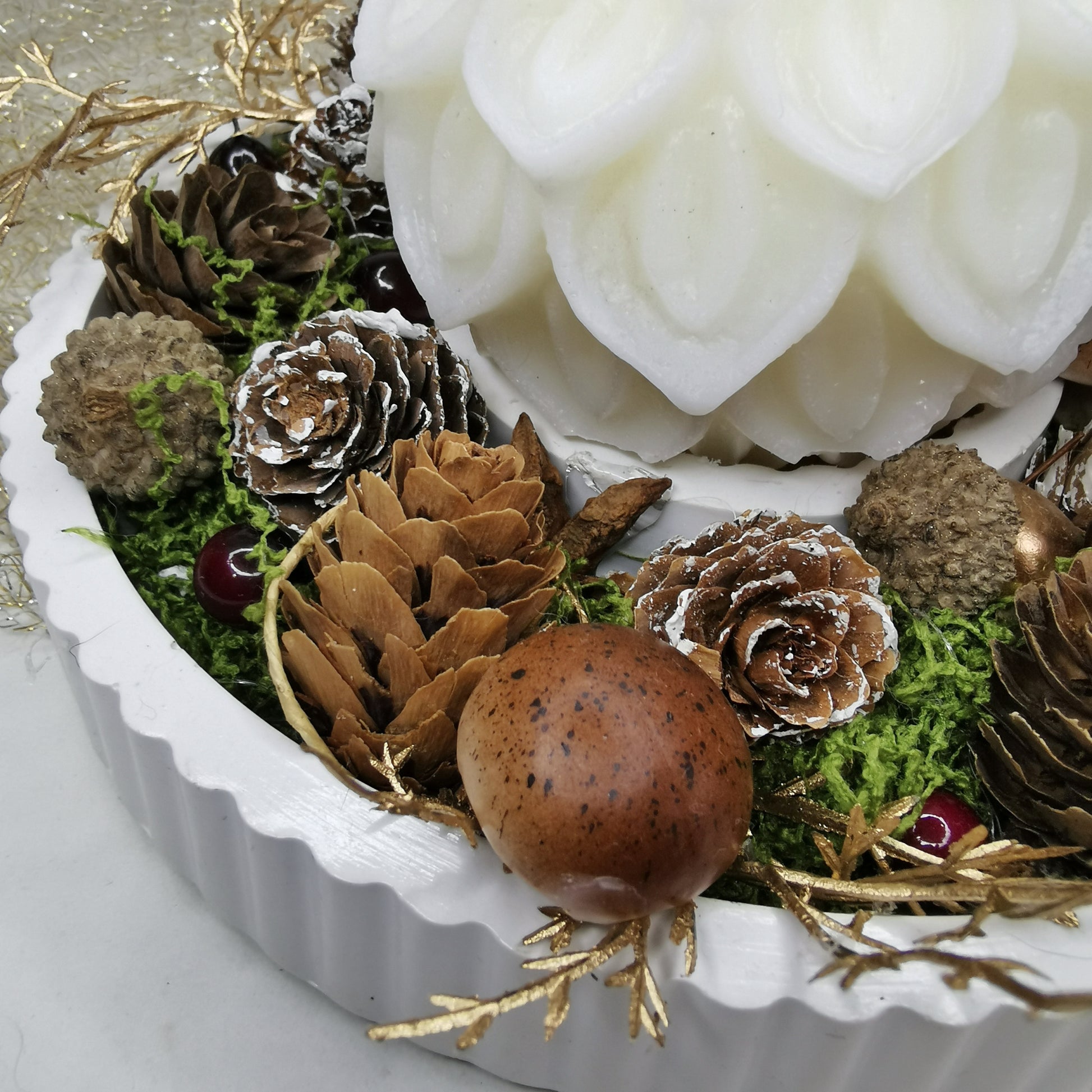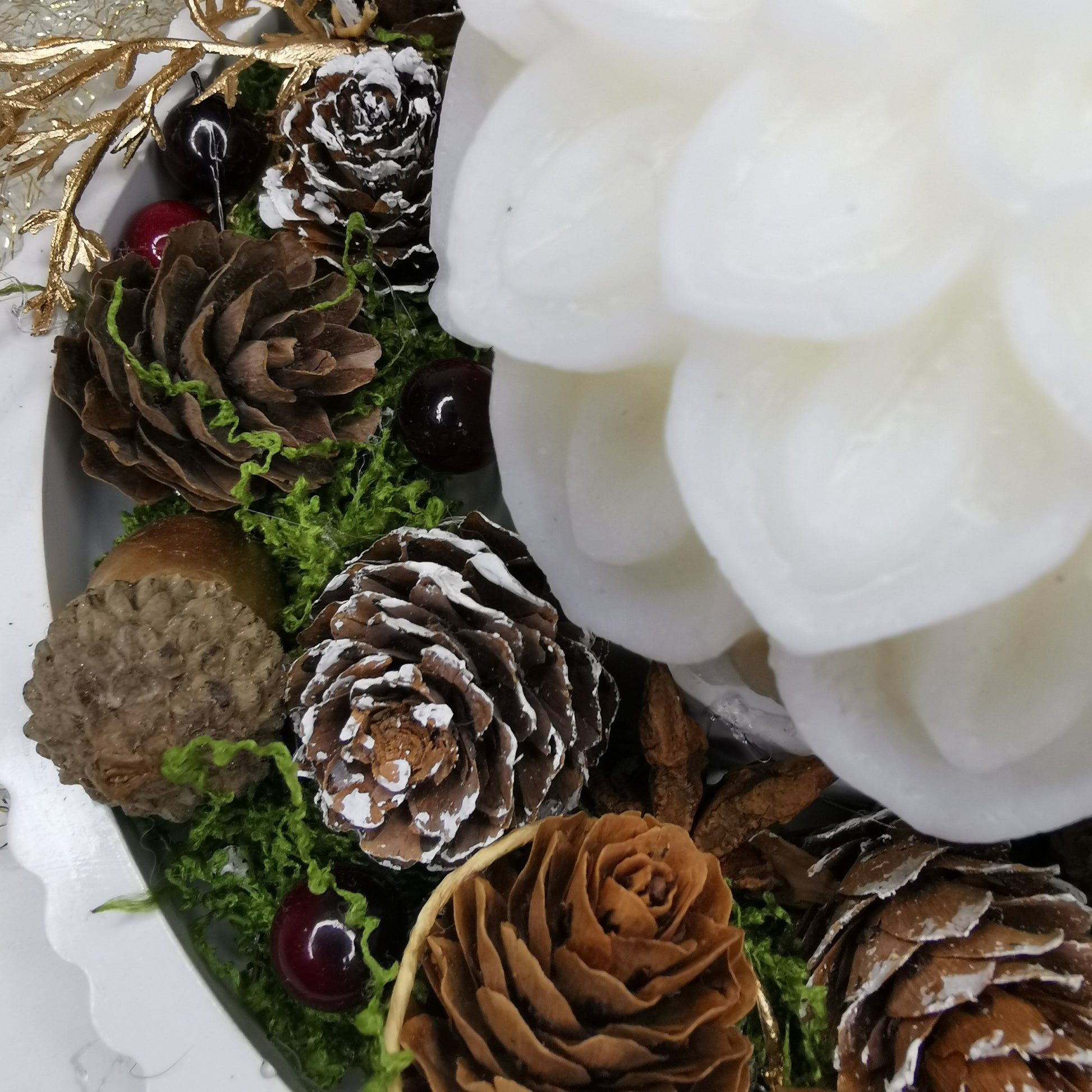 Επιτραπέζιο διακοσμητικό κερί σόγιας με πορσελάνινο δίσκο και αποξηραμένα κουκουνάρια
